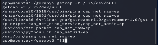 so I started with scanning the file system for files with capabilities using getcap -r / The -r flag tells getcap to search recursively, / to indicate that we want to search the whole system, but I also don’t want to see all the output because of the errors that will come up, so I used 2>/dev/null which yeets the output errors of the command to a blackhole.
